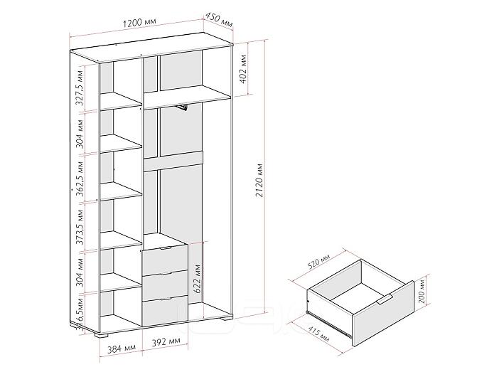 Общие габариты:Высота 212 см, ширина 120 см, глубина 45 см