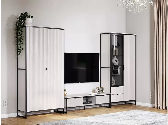 Коллекцию модульной гостиной "Нора" отличает современный оригинальный стиль. Декоративная продольная фрезеровка на фасадах из МДФ и опоры на металлокаркасе соответствуют модным тенденциям этого года в ведущих зарубежных коллекциях.