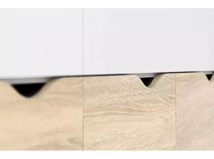 Серия «Соната» отличается простотой и натуральностью, выполнена в естественных тонах. В дизайне отчетливо улавливаются отсылки к скандинавской эстетике: чистые линии корпуса, использование белого цвета в отделке фасадов, расставленные в стороны высокие стильные опоры, выполненные из массива березы.