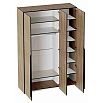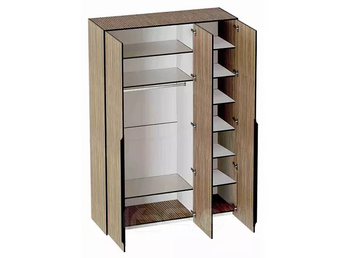 Внутреннее пространство шкафа разделено по вертикали стенкой на два неравных отделения, слева располагается большое платяное отделение с одной продольной штангой, двумя съемными и одной стационарной полкой. Правое отделение меньше по ширине, но более вариативно и в него возможно установить как штангу с тремя полками, так и полный комплект полок, состоящий из одной стационарной и пяти съемных.