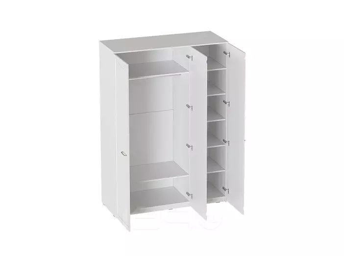 Шкаф выполнен в цвете Айс 06 / Белый Аляска. Классическая фрезеровка фасадов и ручки-скобы из брашированного золота придают изделию особый шарм и элегантность. Внутреннее пространство шкафа разделено на два отделения: слева находится отделение для одежды с одной большой стационарной полкой, одной большой съёмной полкой и продольной металлической штангой; справа находится отделение с одной небольшой стационарной полкой и четырьмя съёмными полками. Двери шкафа оснащены петлями с амортизаторами.