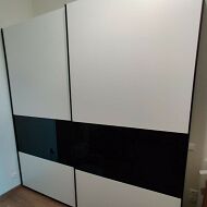 Раздвижные двери – двери с системой открывания купе. Она состоит из дверных полотен, направляющих, роликовых механизмов и ограничителей. Открывание и закрытие дверей происходит путем перемещения полотен по нижней и верхней направляющей, при этом одно из полотен заезжает за другое.